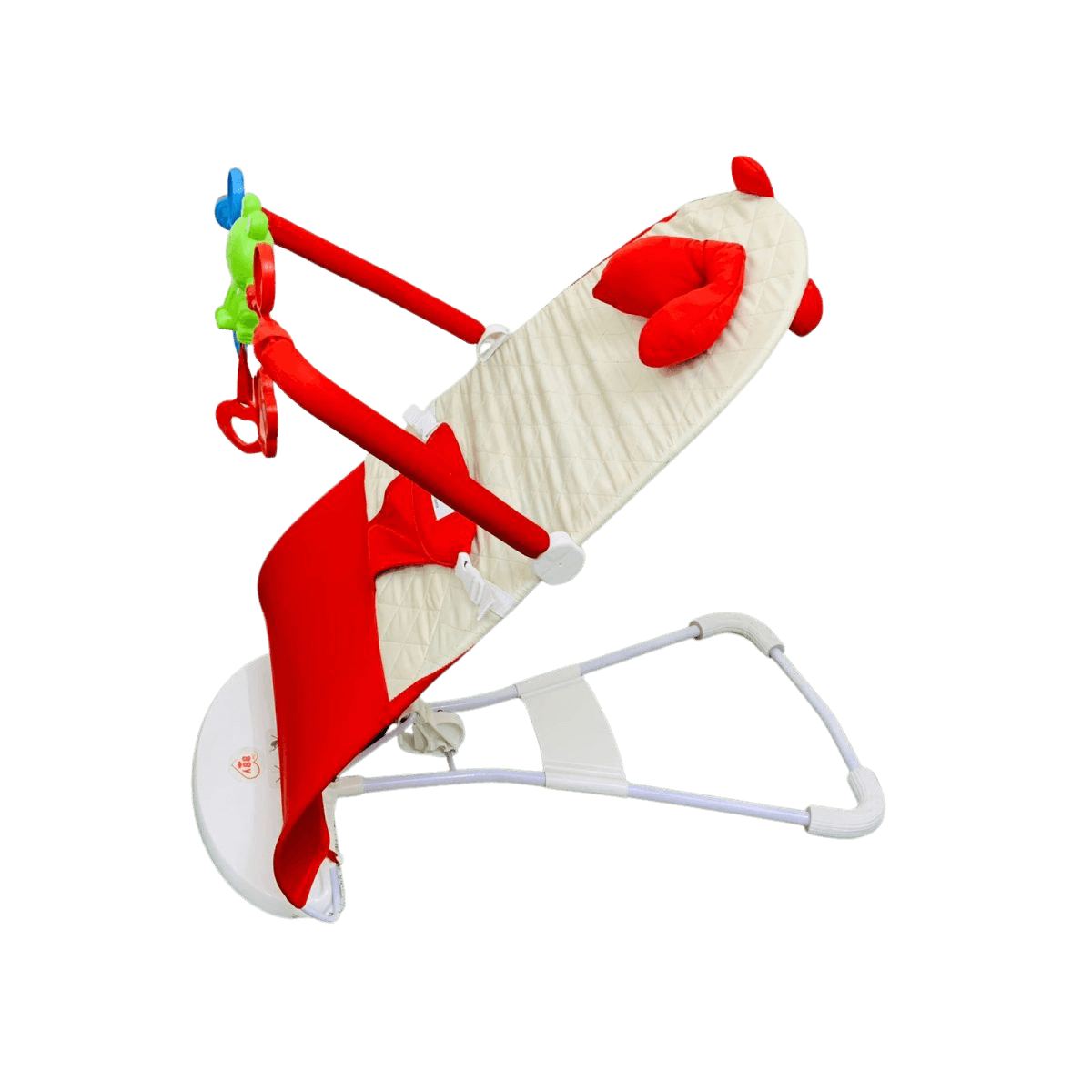 রঙিন খেলনা ঝুলানো আছে যা বাচ্চার মনোযোগ ধরে রাখে ও বিনোদন দেয়।